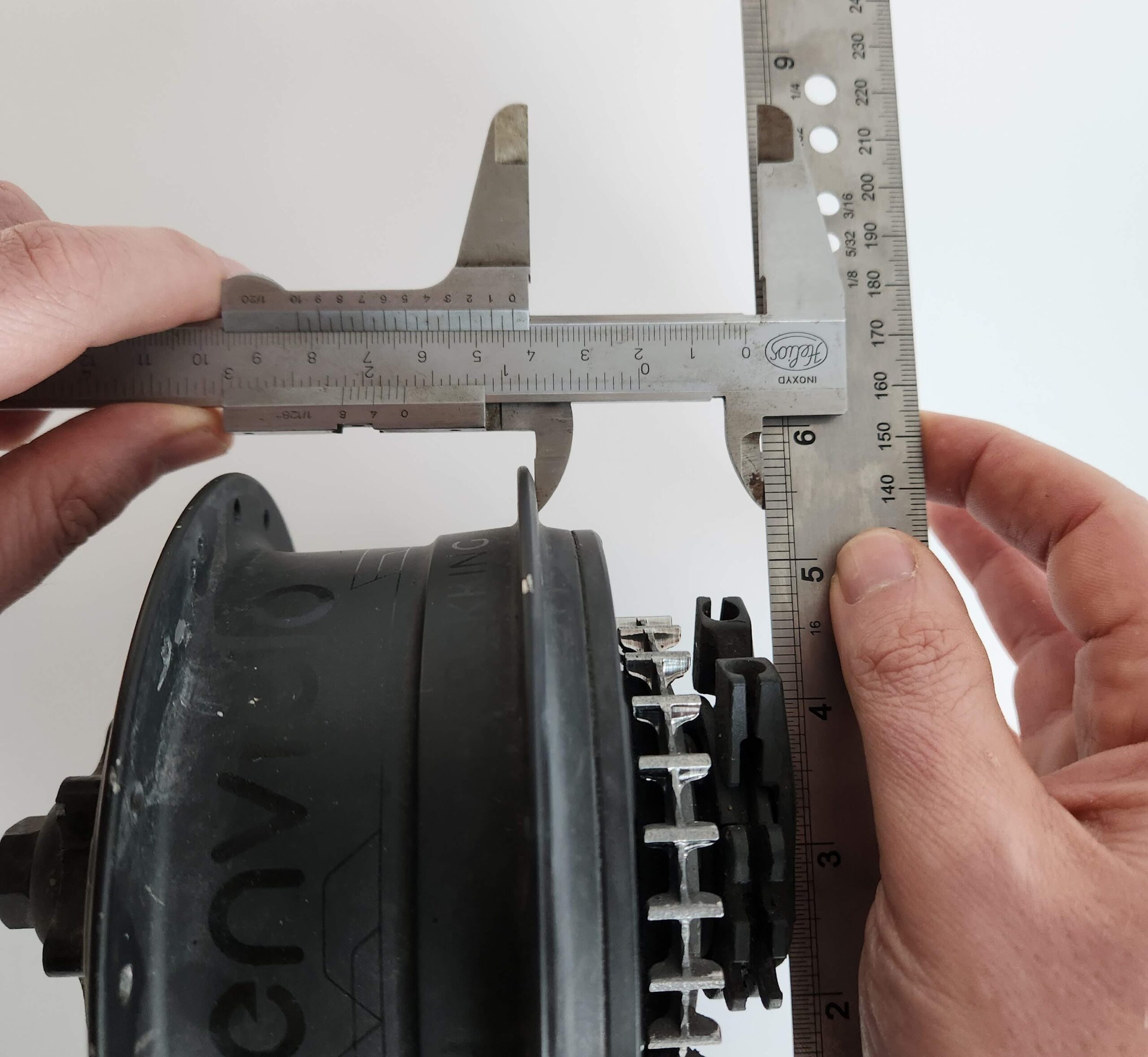 Zum ermitteln der Flanschmitte, brauchen wir erstmal die Nabenbreiten. Dafür messen wir dort, wie im Foto oben gezeigt, wo der Rahmen mit der Nabe verbunden ist. Bei größeren Naben kann man sich mit ein paar Linealen aushelfen, wenn der Messschieber nicht ausreicht. Habt ihr beide Abstände erfasst, könnt ihr diese Werte in die Berechnungshilfe eintragen.